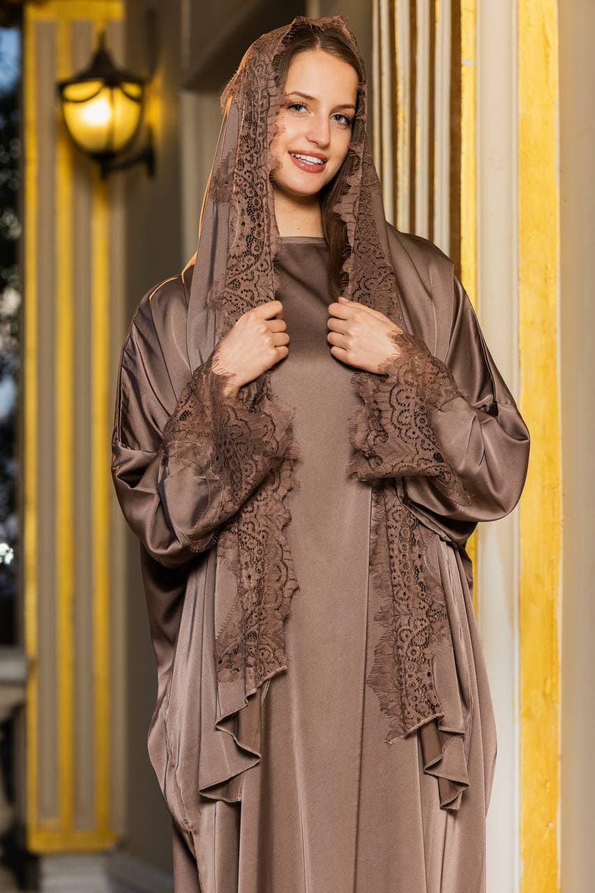 استمتعي بإطلالة راقية ومميزة مع إسدال ستان أرماني المستورد المطعّم بدانتيل أنيق، تصميم يجمع بين الاحتشام والفخامة في قطعة واحدة.